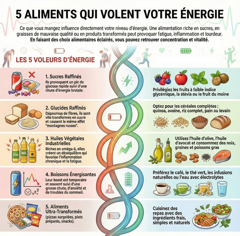 Dans cet article, nous allons explorer cinq catégories d'aliments qui, sans que vous le sachiez, peuvent voler votre énergie. Pour chacune d'elles, nous vous proposerons des alternatives saines et nourrissantes pour vous aider à retrouver votre dynamisme au quotidien.